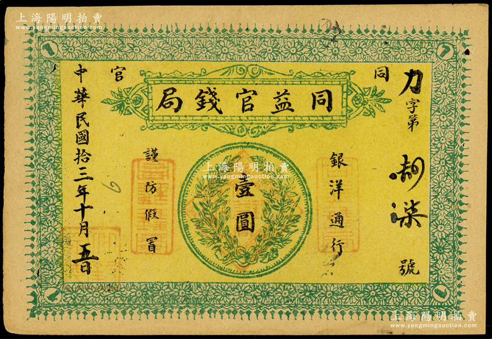 民国拾三年(1924年)同益官钱局银洋壹圆,上印银币图,发行于陕西铜川县(原名同官,因与“潼关”谐音,故于1949年改称铜川),少见,八五成新