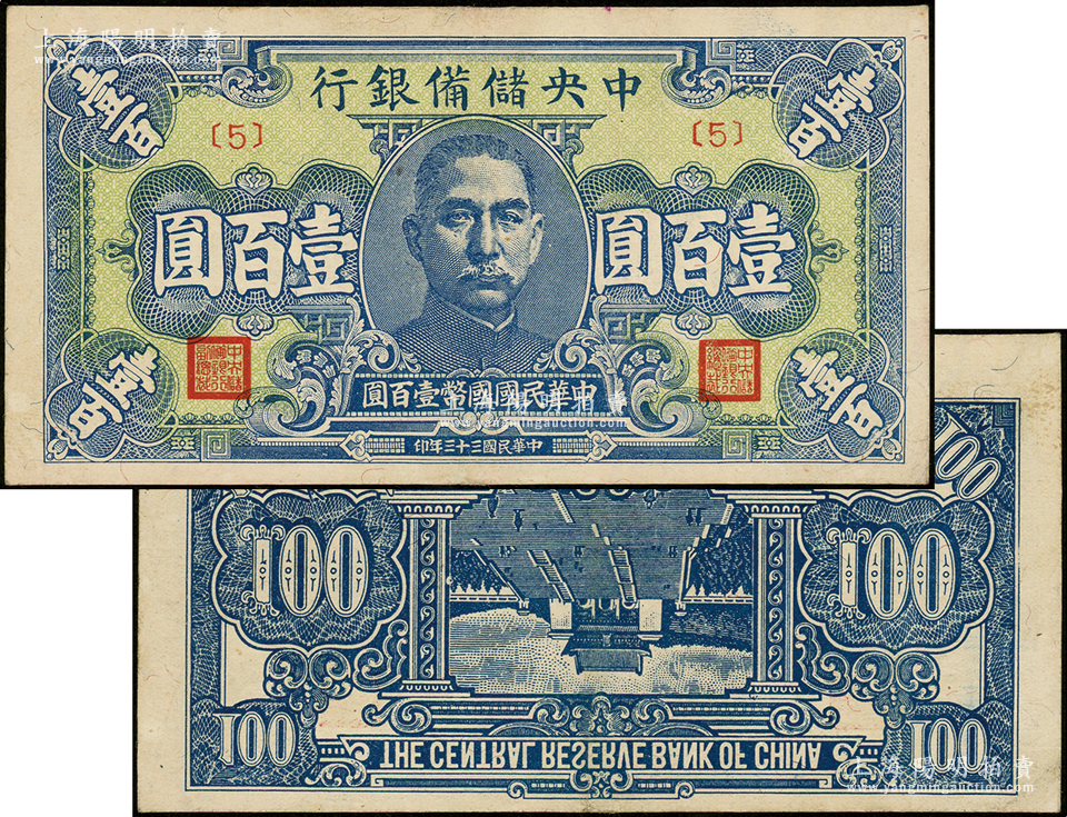 民国三十三年(1944年)中央储备银行蓝色壹百圆,错版券·背面图案倒印,堪称别致佳品;源于前辈名家之遗藏,九至九五成新,值得预览和珍视