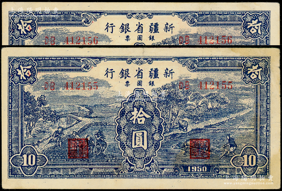 1950年新疆省银行银圆票蓝色耕种图拾圆共2枚连号,八至九成新