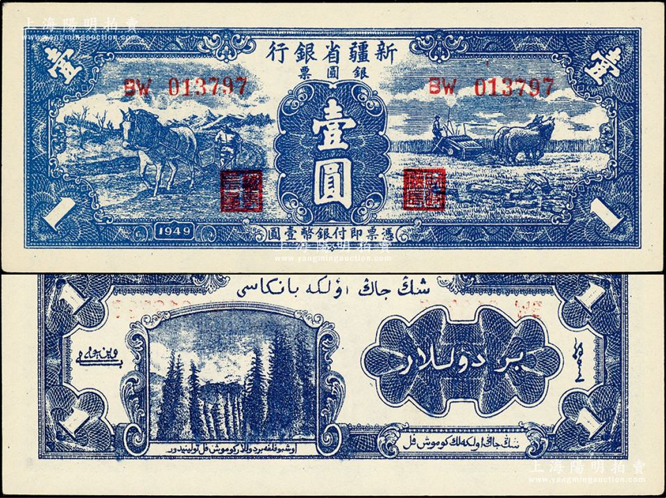 1949年新疆省银行银圆票壹圆,属第二版,背印白文昱签名;前辈藏家出品,原汁原味,九八成新