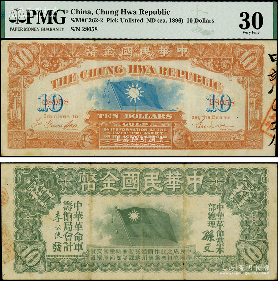 中华民国金币券(1911年)壹拾员,由中华革命党总理孙文签名,5位数号码券;岭南藏家出品,原票八成新