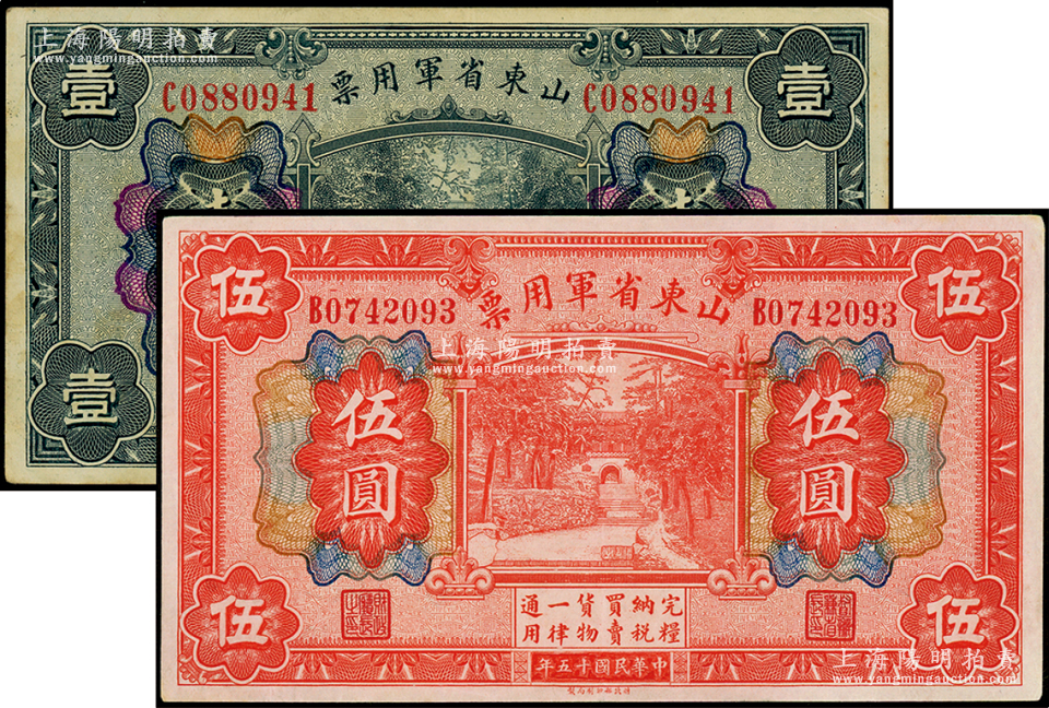 民国十五年(1926年)山东省军用票壹圆、伍圆共2枚不同,军阀张宗昌氏发行,原票八至九成新