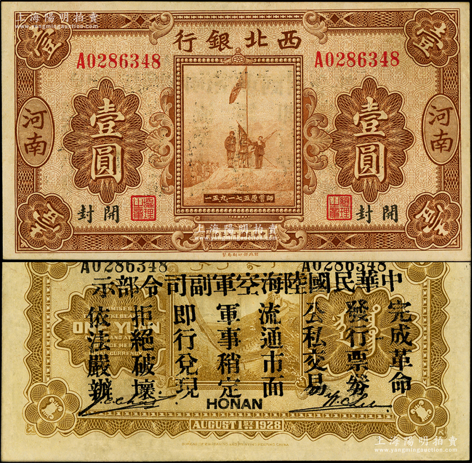 民国十七年(1928年)西北银行五原誓师图壹圆,河南·开封地名,背印“中华民国陆海空军副司令部示”,乃中原大战时代冯玉祥氏发行之军用钞票;江南藏家出品,九成新