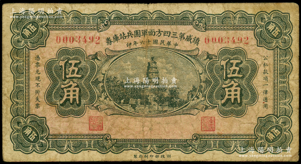 民国十六年(1927年)镇威第三四方面军团兵站库券伍角,由奉系张学良氏发行北京一带;海外藏家出品,少见,原票七成新