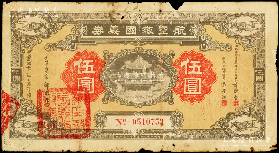 民国二十一年(1932年)航空救国义券伍圆,由国民革命军第一集团军总司令陈济棠、广东财政特派员区芳浦、广州市商会主席邹殿邦签名发行,背印章程简要;岭南藏家出品,罕见,原票六成新