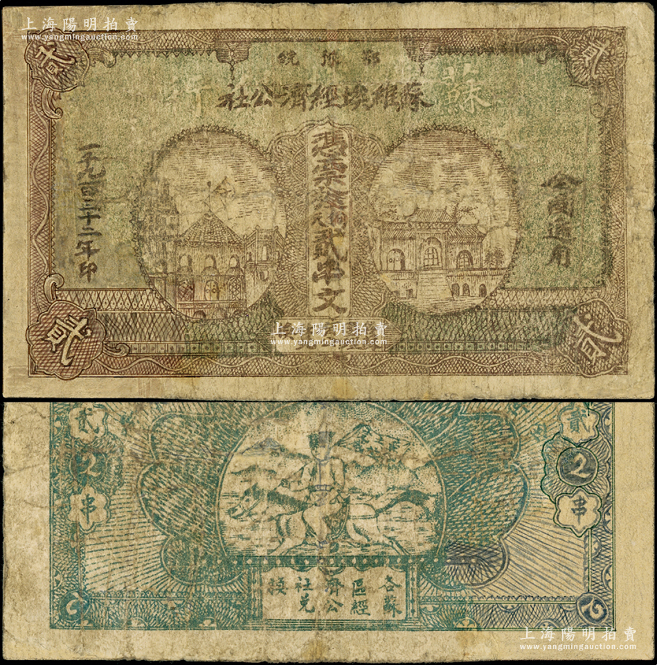 1932年鄂豫皖苏维埃经济公社铜元贰串文,左边印有房屋图,背印“全世界无产阶级联合起来”和“完成土地革命”之口号;资深藏家出品,少见,有修补,七成新,敬请预览