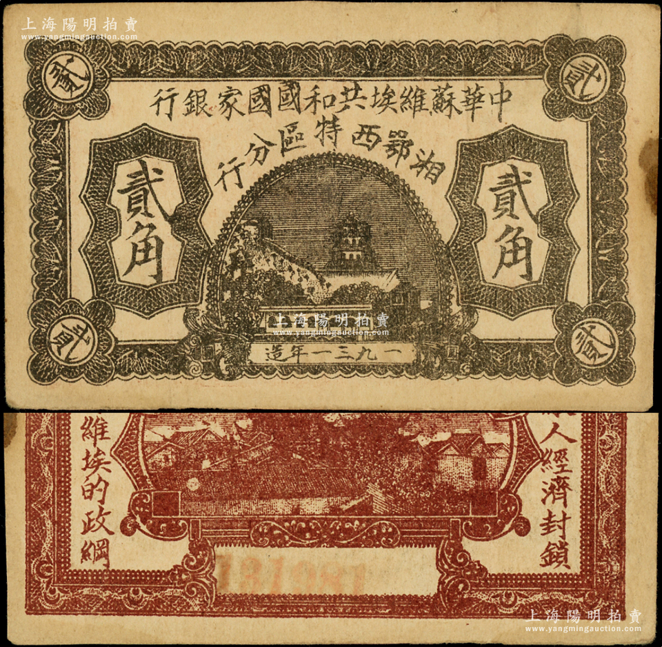 1931年中华苏维埃共和国国家银行湘鄂西特区分行贰角,背印“冲破敌人经济封锁,实现苏维埃的政纲”革命口号;该特区属中共三大苏区之一,由贺龙领导的中国工农红军第二军团所开创;罕见,已属所见之较佳品相,正背图案清晰,唯惜右边侧有小黄斑,八成新