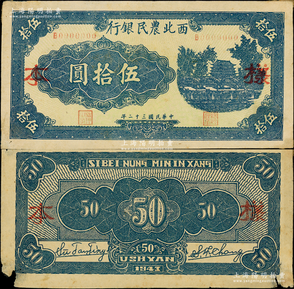 民国三十二年(1943年)西北农民银行蓝色城楼图伍拾圆样本券,正背共2枚,属圆体号码版,少见,原票七至九成新