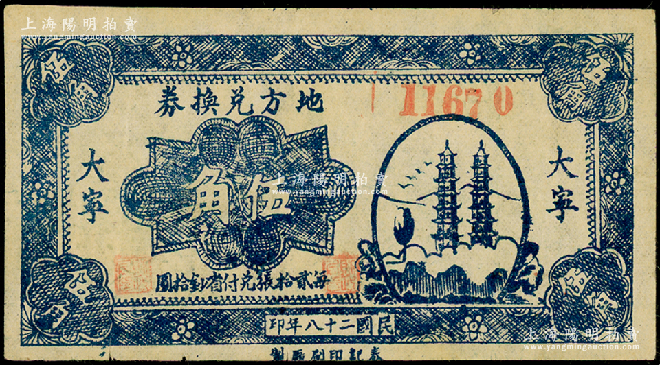 民国二十八年(1939年)地方兑换券蓝色双塔图伍角,“大宁”地名,山西解放区纸币,由泰记印刷厂单面印制;源于名家典藏,少见且品相甚佳,原票八至八五成新