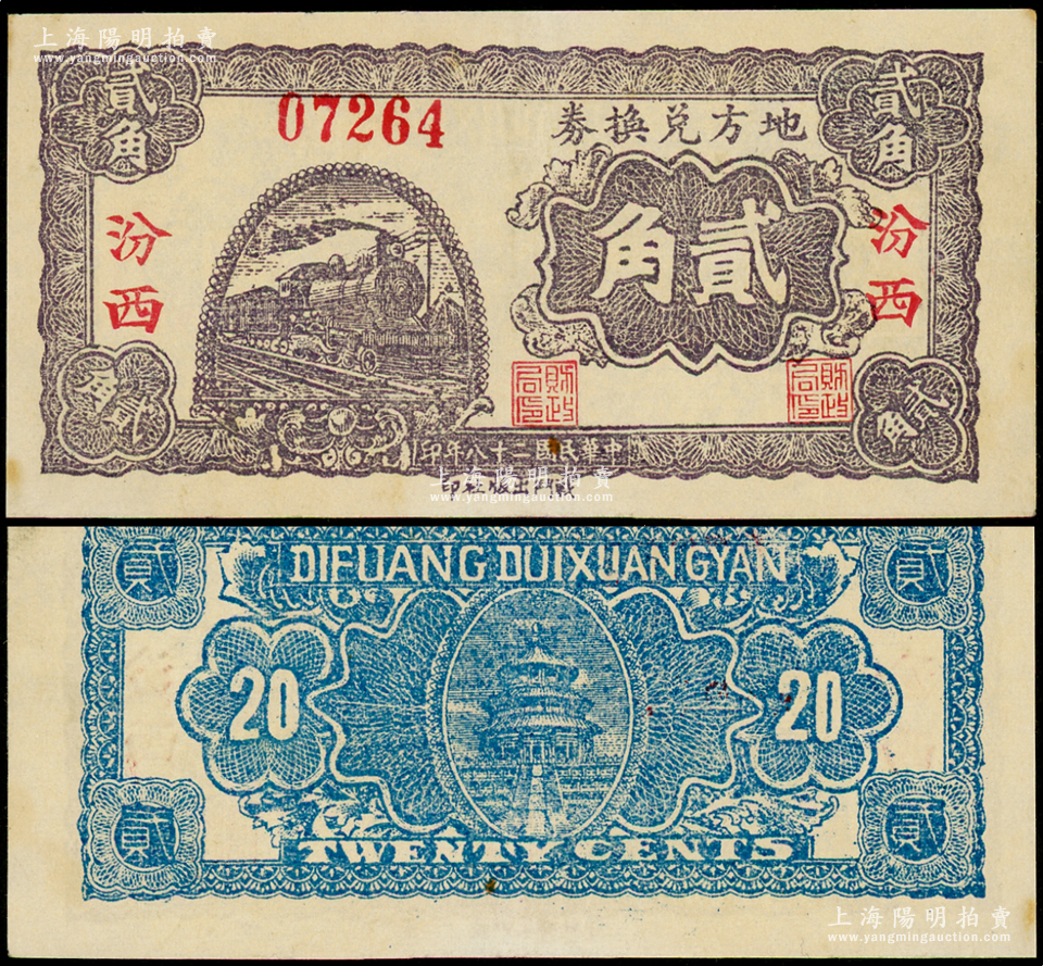 民国二十八年(1939年)地方兑换券贰角,“汾西”地名,山西解放区纸币,由战斗出版社印制;源于名家典藏,罕见且品相甚佳,九成新