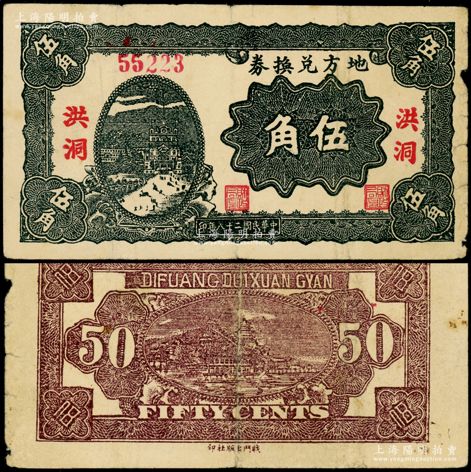 民国二十八年(1939年)地方兑换券伍角,“洪洞”地名,山西解放区纸币,由战斗出版社印制;源于名家典藏,原票七五成新