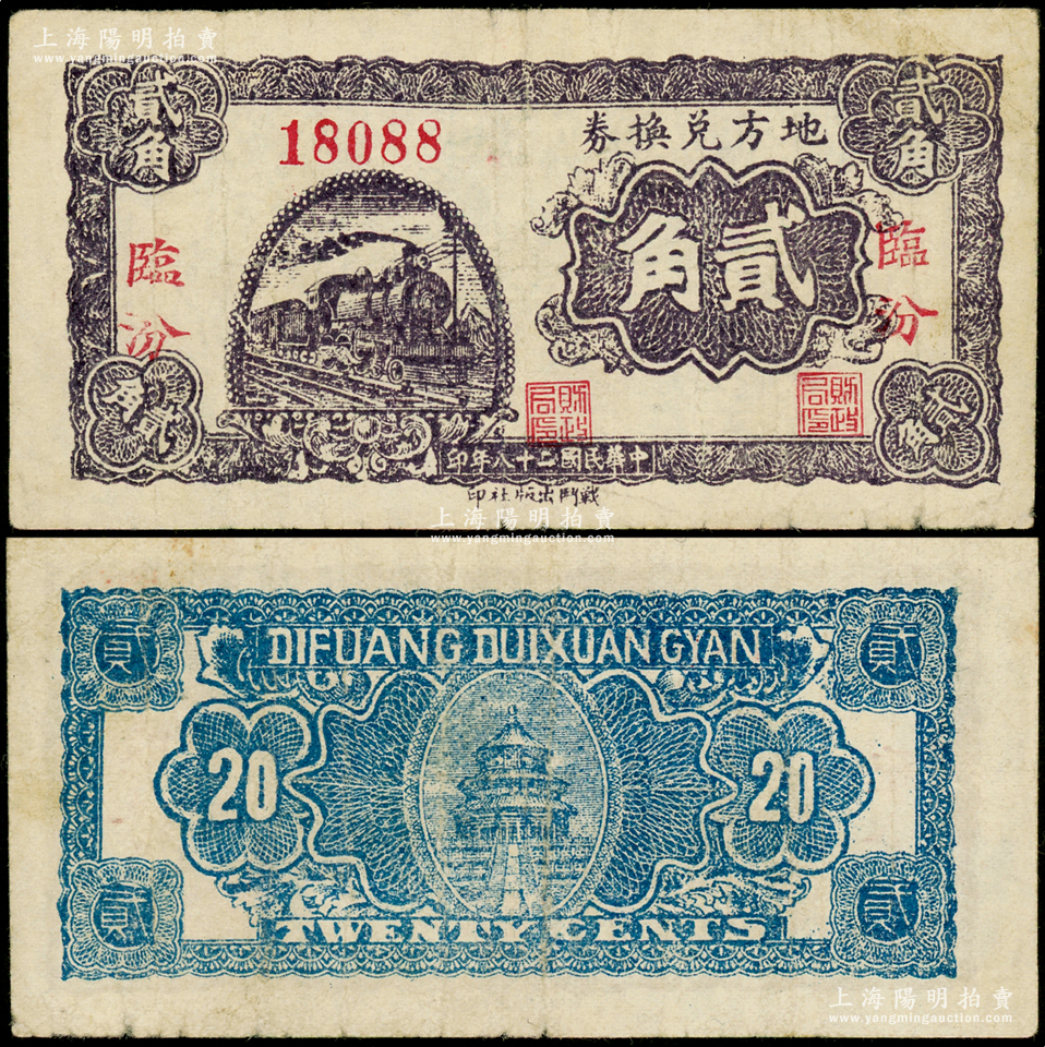 民国二十八年(1939年)地方兑换券贰角,“临汾”地名,倒置号,山西解放区纸币,由战斗出版社印制;源于名家典藏,少见,原票近八成新