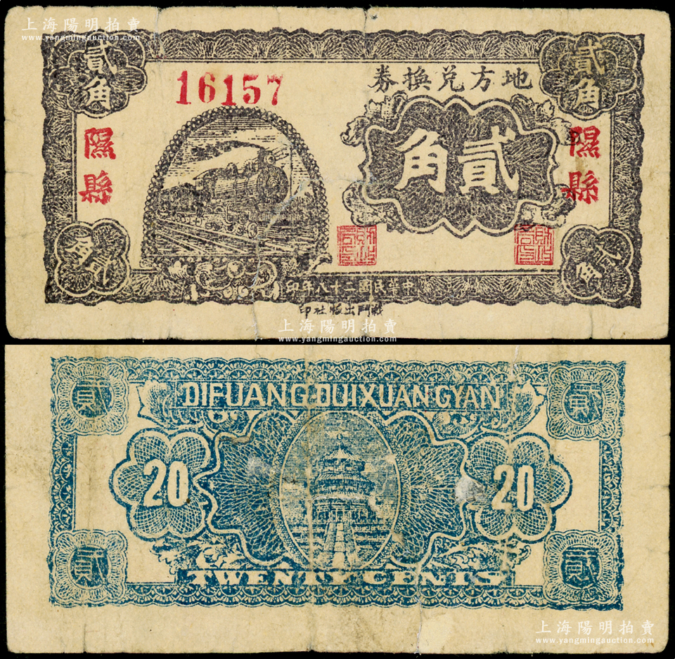 民国二十八年(1939年)地方兑换券贰角,“隰县”地名,山西解放区纸币,由战斗出版社印制;源于名家典藏,罕见,七成新,敬请预览