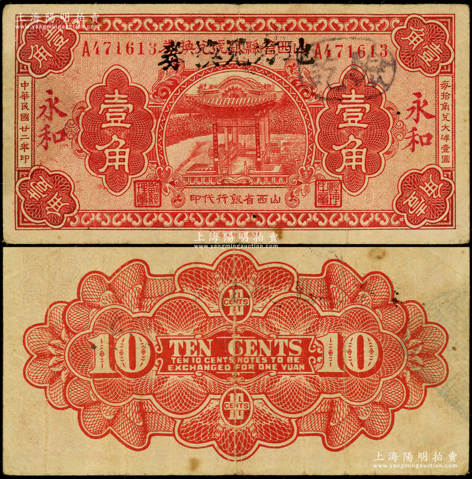 民国廿二年(1933年)山西省县银号兑换券改“永和地方兑换券”壹角,山西革命根据地货币,在《民国山西纸币》一书第2652页有记载,属临时借用改造券;资深藏家出品,少见,原票近八成新