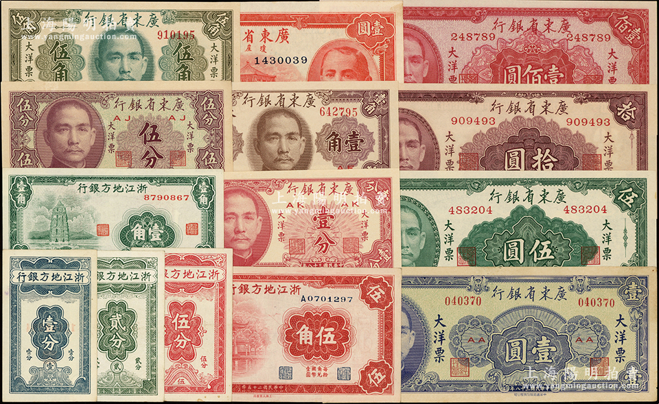 民国省钞14种,详分:浙江地方银行竖式壹分、贰分、伍分,1936年壹角、伍角;广东省银行1940年琼崖区壹圆,1949年大洋票壹分、伍分、壹角、伍角、壹圆、伍圆、拾圆、壹佰圆;源于前辈名家之遗藏,九成至全新