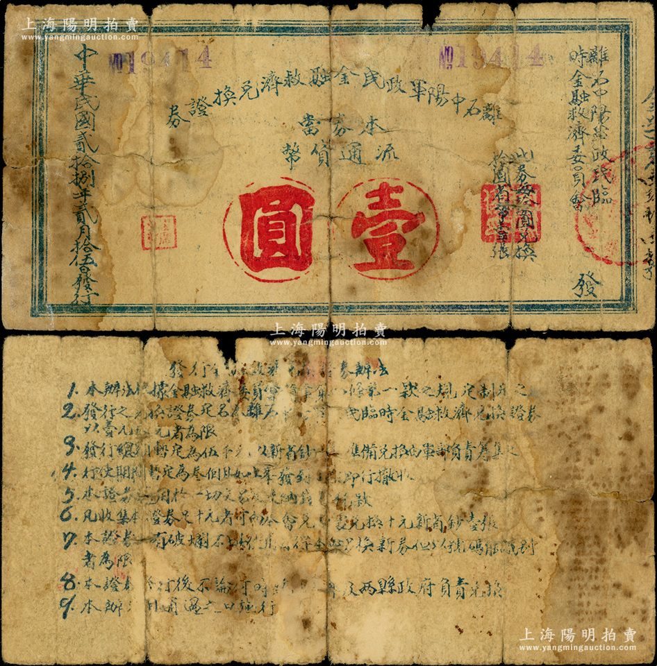 民国贰拾捌年(1939年)离石中阳军政民金融救济兑换证券壹圆,由离石、中阳两县联合发行,背印“发行金融救济兑换证券办法”9条,此券在《民国山西纸币》第五卷2999号有图片记录,已明确为抗日根据地纸币;源于名家典藏,罕见,目前存世或仅见2枚,近七成新,敬请预览和重视