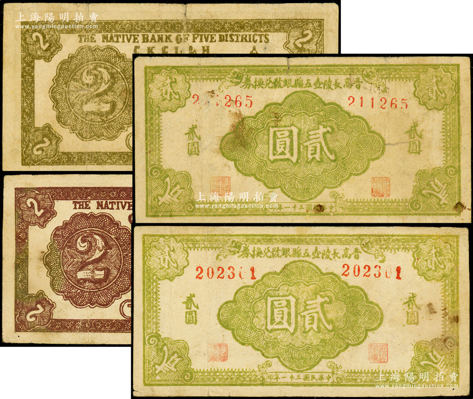民国三十一年(1942年)晋高长陵壶五县银号兑换券贰圆共2种不同,其正面均为绿色印刷,背面分别为“深棕色”和“黄绿色”印刷,山西晋东南解放区纸币;资深藏家出品,原票七至八成新(注:此五县即指晋城、高平、长治、陵川、壶关5县)
