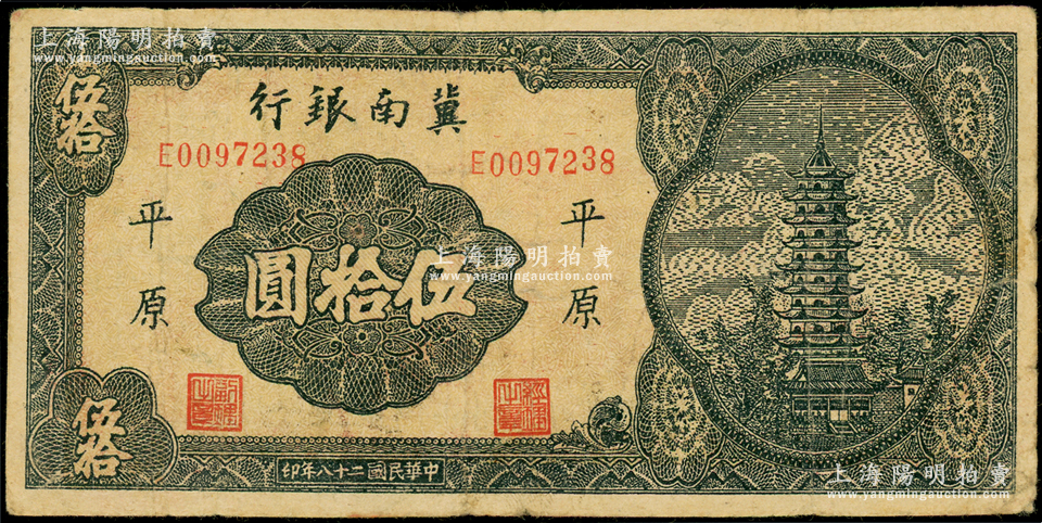 民国二十八年(1939年)冀南银行宝塔图伍拾圆,“平原”地名,小号码版,少见,原票七成新