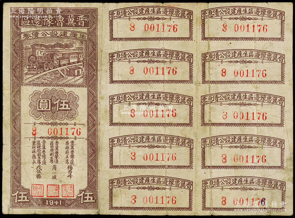 1941年晋冀鲁豫边区生产建设公债券伍圆,附带完整息票,属解放区债券;资深藏家出品,原票七成新