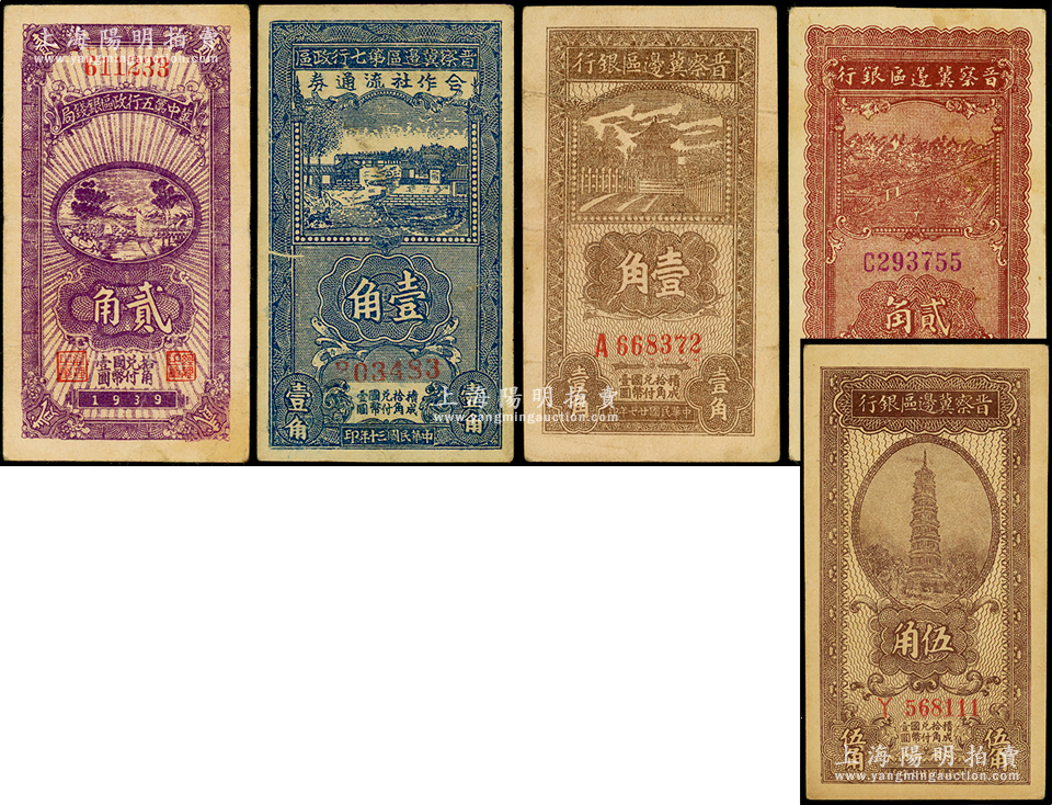 晋察冀区票5种,详分:晋察冀边区银行1938年壹角、伍角,1940年贰角;冀中第五行政区银钱局1939年贰角;晋察冀边区第七行政区合作社流通券1941年蓝色壹角;原票整体约八成新,敬请预览