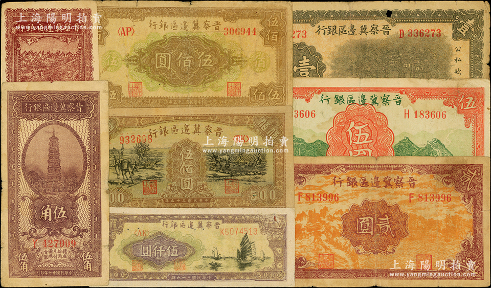 晋察冀边区银行纸币8种,详分:1938年伍角,1939年壹圆、贰圆、伍圆,1940年贰角,1946年花纹图伍佰圆、赶骡与耕地图伍佰圆,1947年伍仟圆,原票七至七五成新,敬请预览