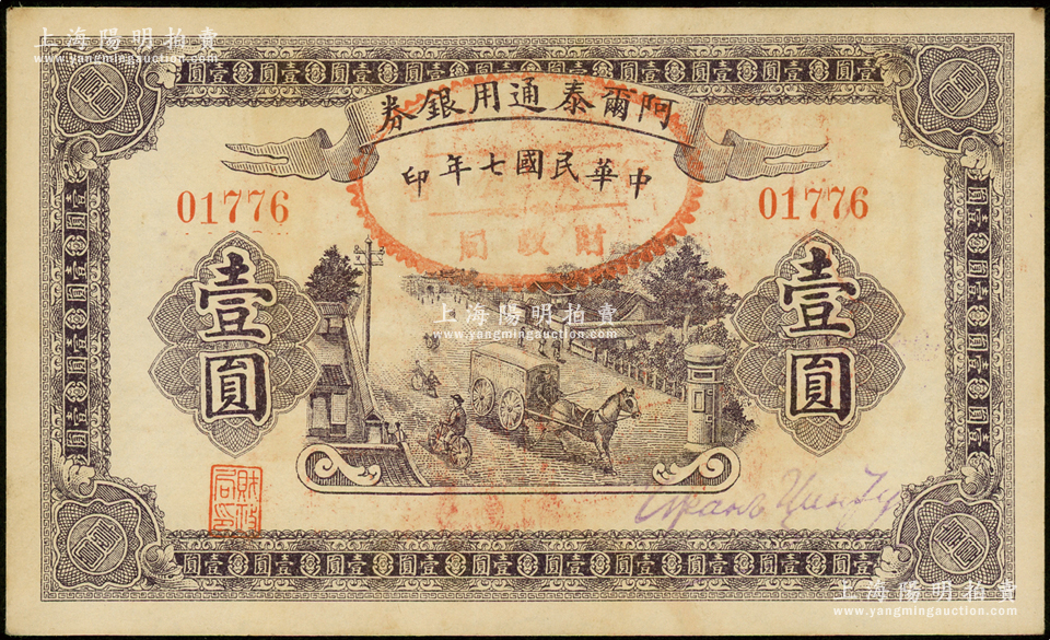 民国七年(1918年)阿尔泰通用银券壹圆,属新疆特区纸币;源于前辈名家之遗藏,九成新