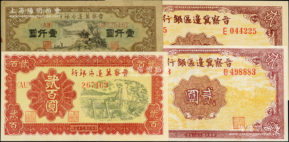晋察冀边区银行纸币4枚,详分:1939年贰圆不同字轨2枚,1946年打井水贰百圆,1947年凉亭图壹仟圆,八至九成新