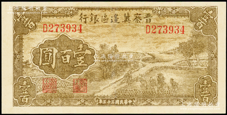 民国三十三年(1944年)晋察冀边区银行插秧图壹百圆,属少见品种,有修补,七五成新