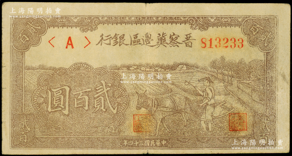民国三十四年(1945年)晋察冀边区银行赶驴图贰百圆,薄纸版,原票八成新