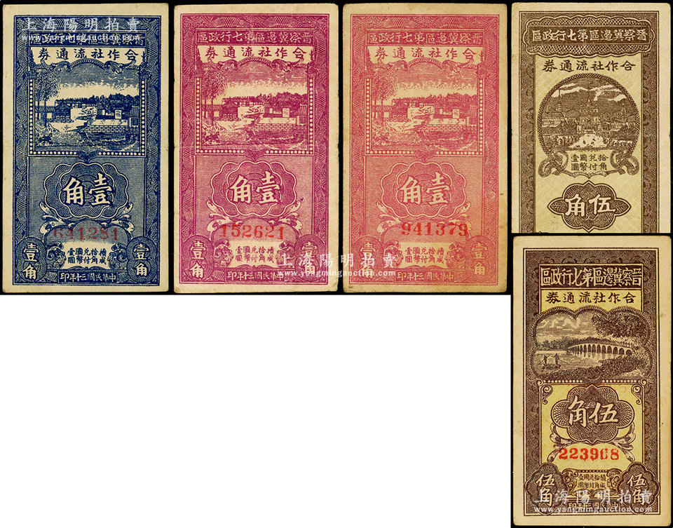 晋察冀边区第七行政区合作社流通券共5种不同,详分:1941年蓝色壹角大号码、紫色壹角颜色不同2种、伍角,1942年红号码伍角;海外藏家出品,原票八至八五成新