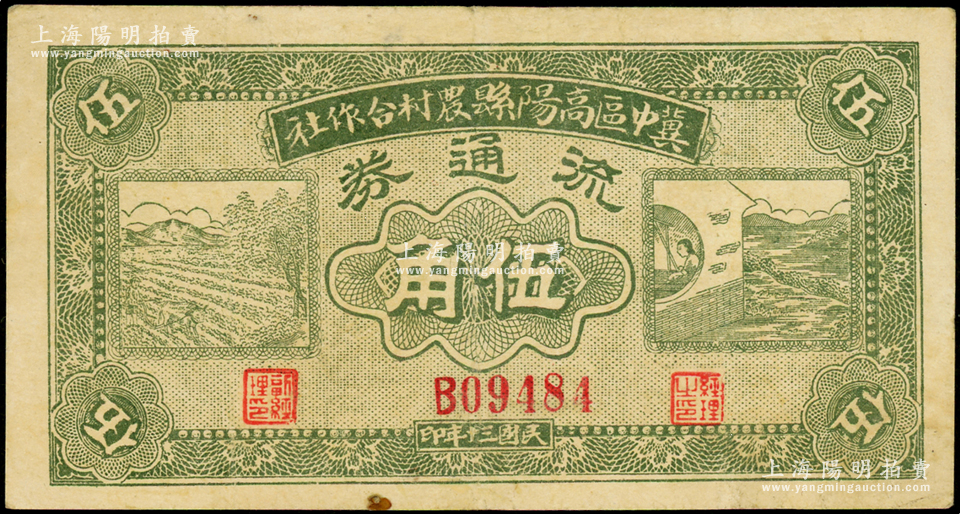 民国三十年(1941年)冀中区高阳县农村合作社流通券绿色伍角,B字轨5位数号码券,八成新