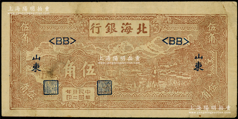 民国卅二年(1943年)北海银行棕色牛耕田伍角,山东地名,浅色版