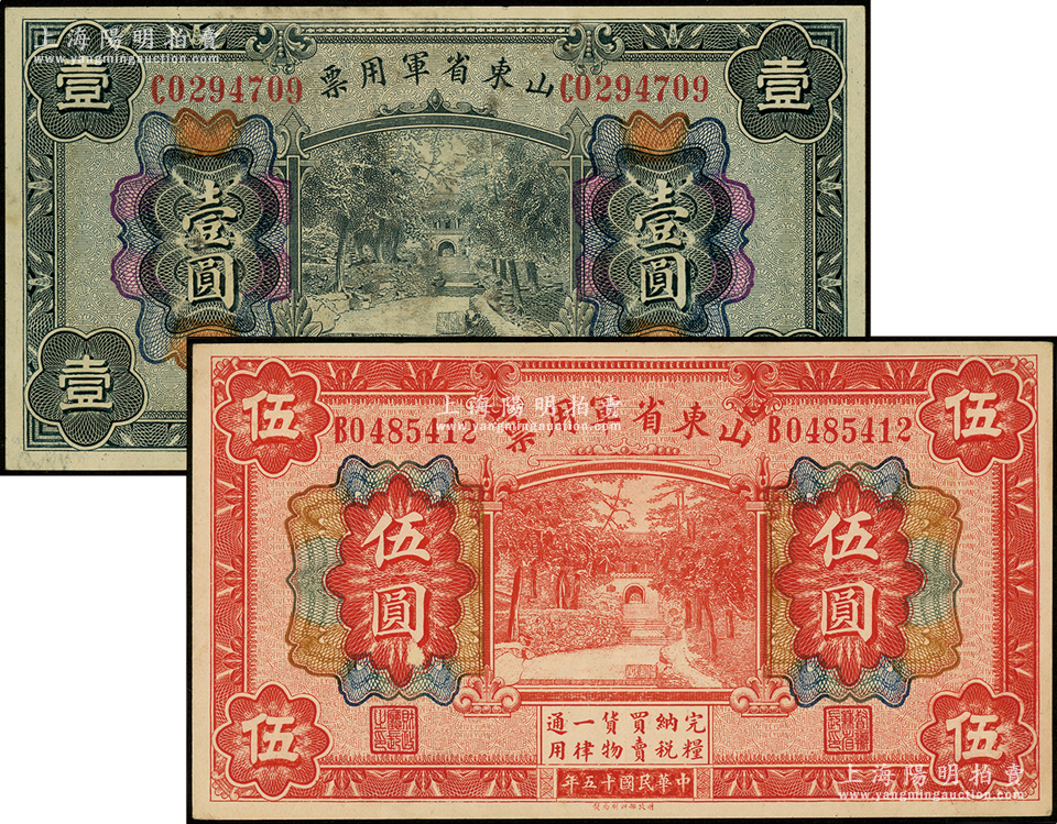 民国十五年(1926年)山东省军用票壹圆、伍圆共2枚不同,军阀张宗昌氏发行;源于前辈名家之遗藏,八五至九成新