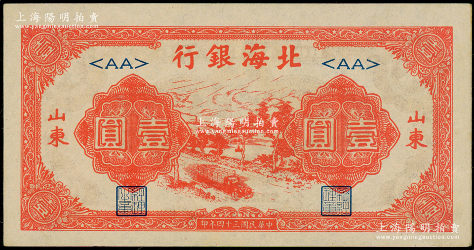 民国三十四年(1945年)北海银行红色公路汽车图壹圆,山东地名,