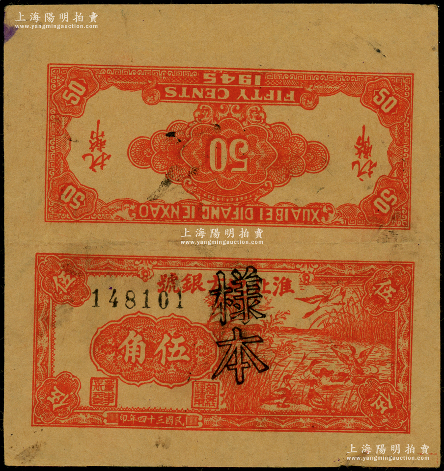 民国三十四年(1945年)淮北地方银号红色芦苇荡野鸭图伍角试印样本票,新四军抗币之珍罕品种,诚可遇而不可求也;源于新四军某司务长之遗存,九成新