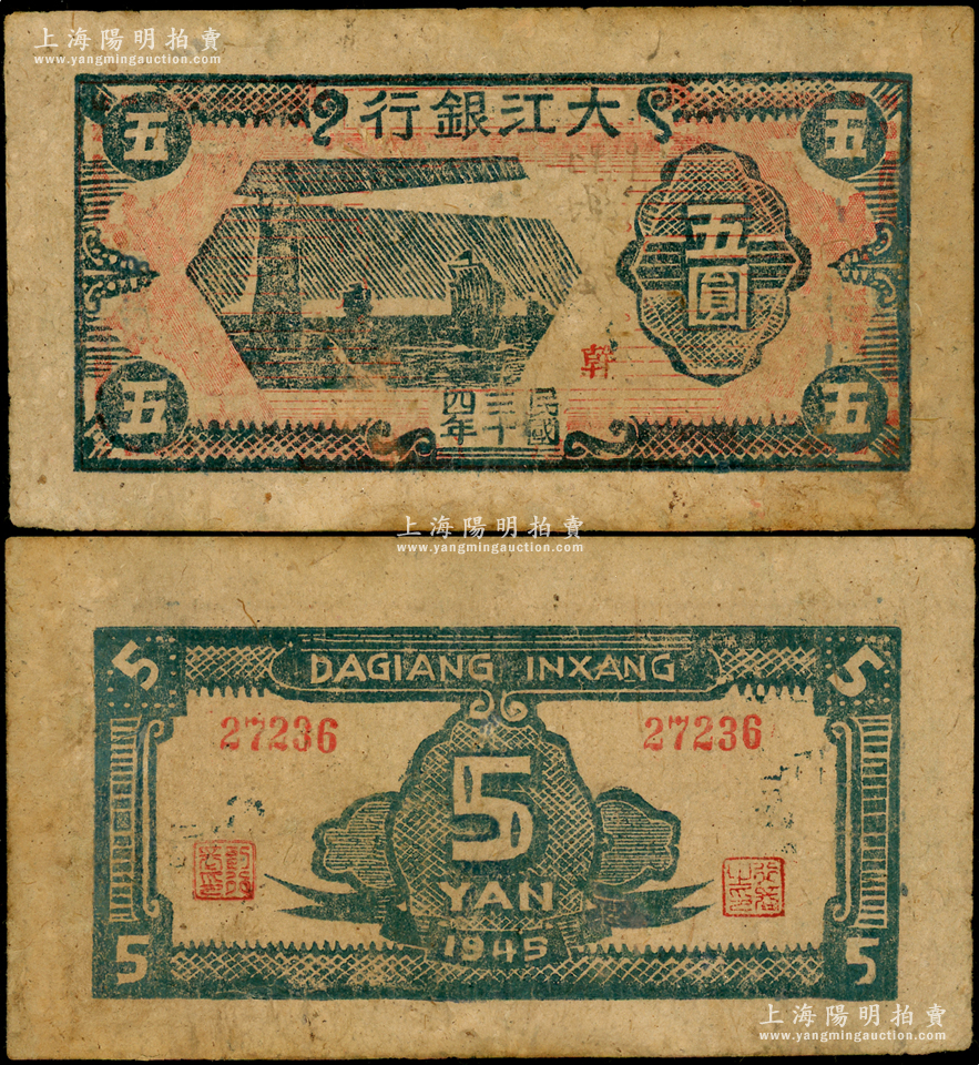 民国三十四年(1945年)大江银行木刻版五圆,蓝色灯塔帆船图,加盖红色“幹”字;此种颜色券存世罕见(注:以往所见均为棕色版“和含”地名者),源于名家旧藏,边有修补,八成新