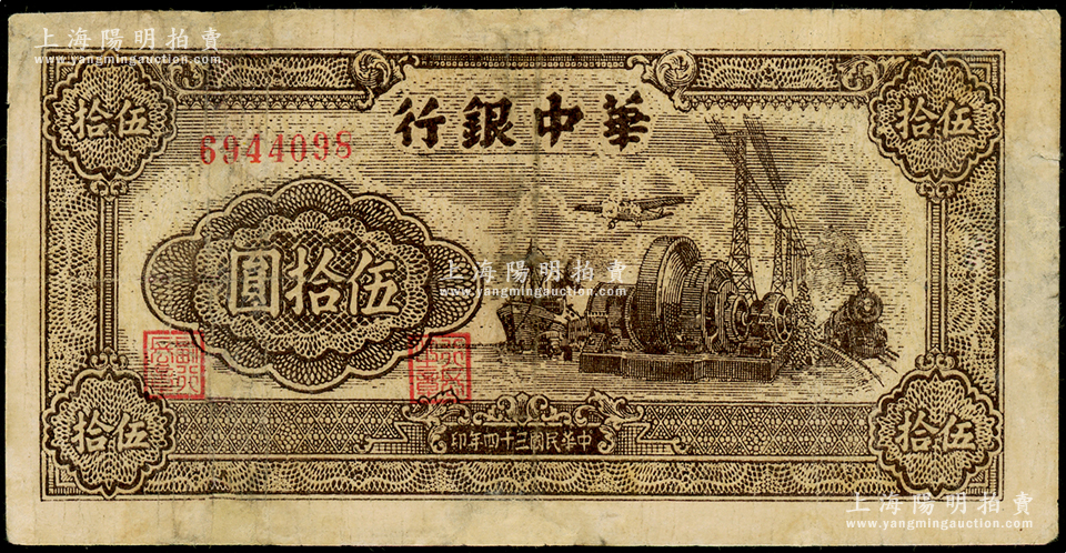 民国三十四年(1945年)华中银行汽轮机图伍拾圆,有修补,七成新,敬请预览