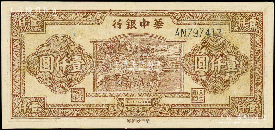 民国三十六年(1947年)华中银行棕色牛耕田图壹仟圆,黑色号码券,有修补,七成新