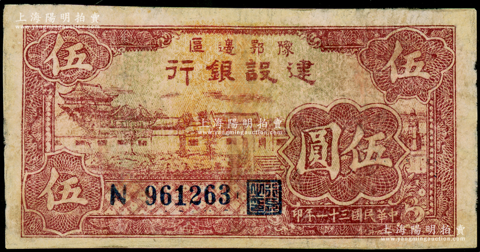 民国三十一年(1942年)豫鄂边区建设银行红色村落房屋图伍圆,属新四军第五师李先念部领导的中共豫鄂边区货币,有修补,七成新