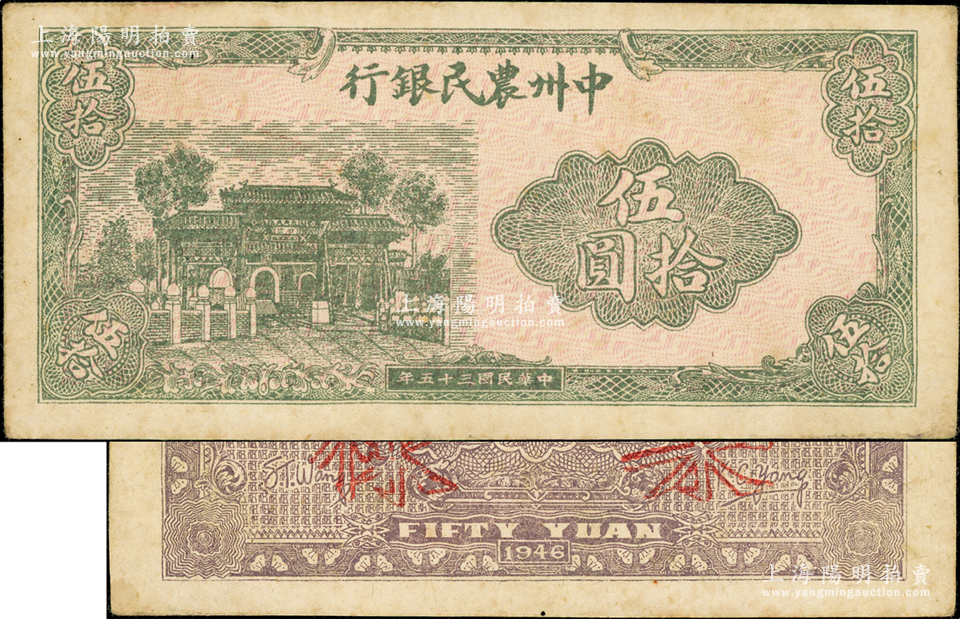 民国三十五年(1946年)中州农民银行伍拾圆票样,正背面合印;俞建国律师藏品,少见,未折近九成新
