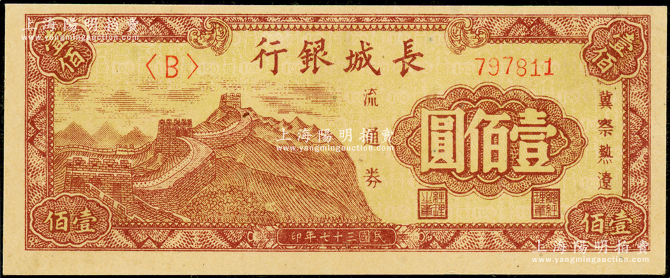 民国三十七年(1948年)长城银行冀察热辽流通券长城图壹佰圆,八五成新