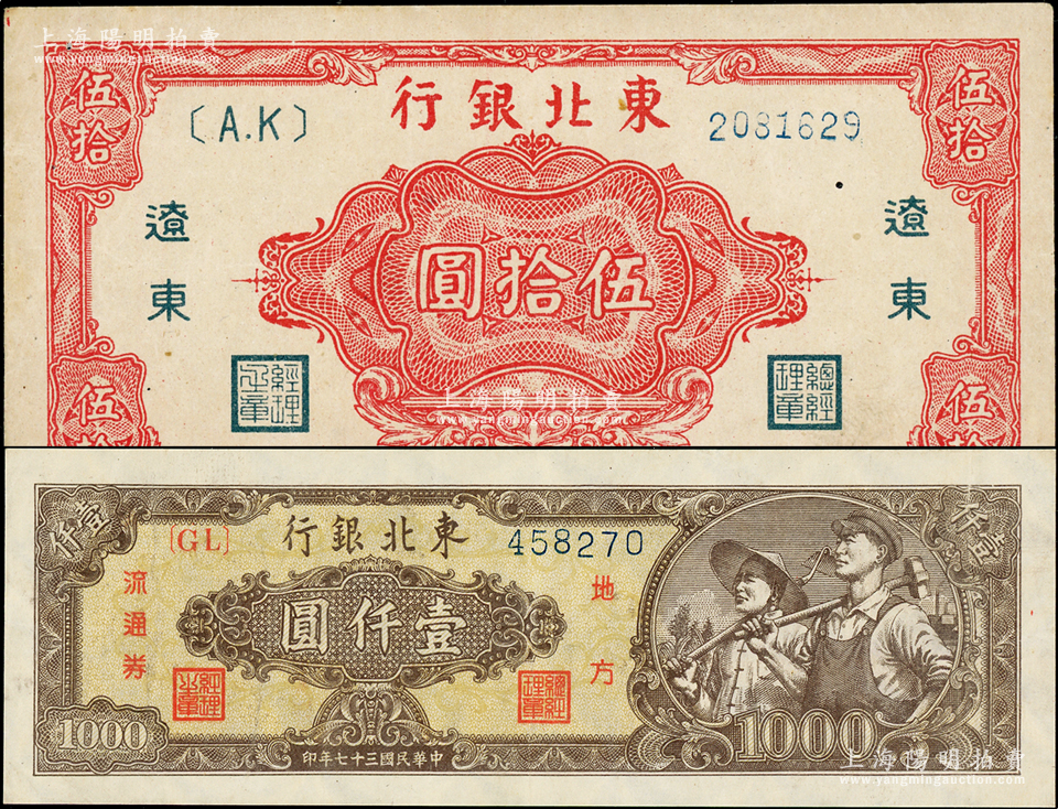 东北银行纸币2种,详分:1945年“辽东”红色伍拾圆、1948年工农图壹仟圆,八五至九成新