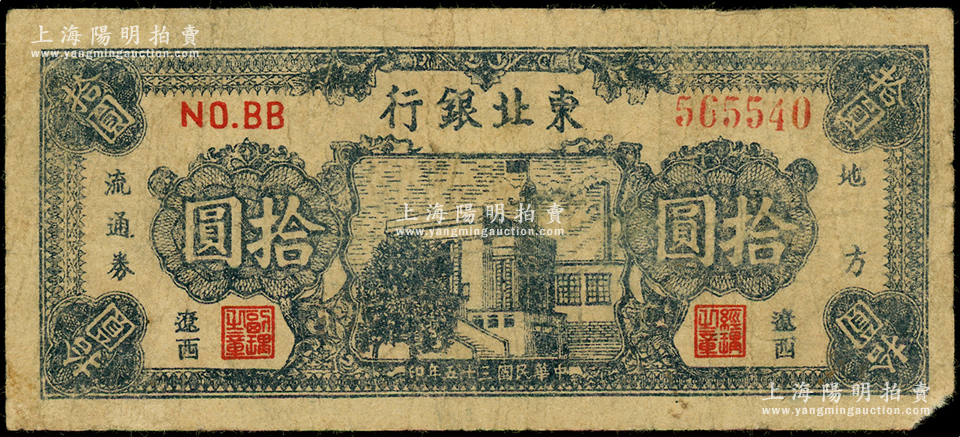 民国三十五年(1946年)东北银行地方流通券蓝色楼房图拾圆,辽西地名,少见,原票七成新