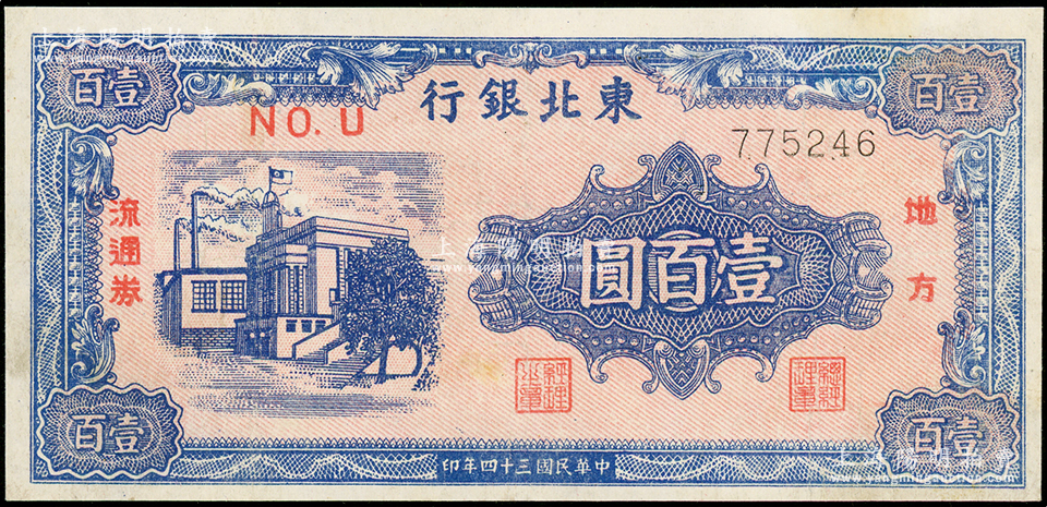 民国三十四年(1945年)东北银行地方流通券壹百圆,细体号码版,八成新