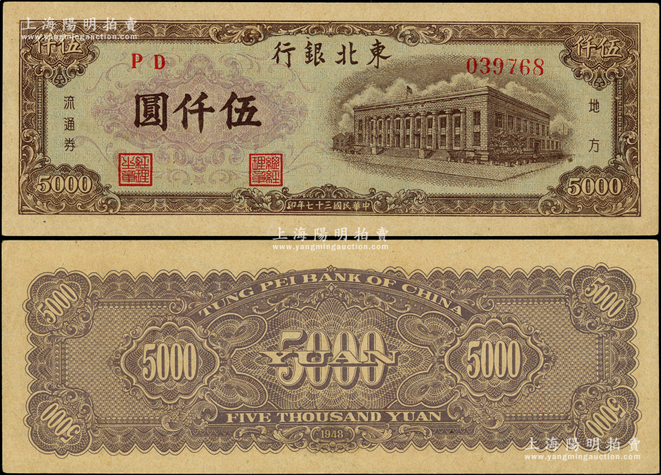 民国三十七年(1948年)东北银行地方流通券棕色伍仟圆,九八成新