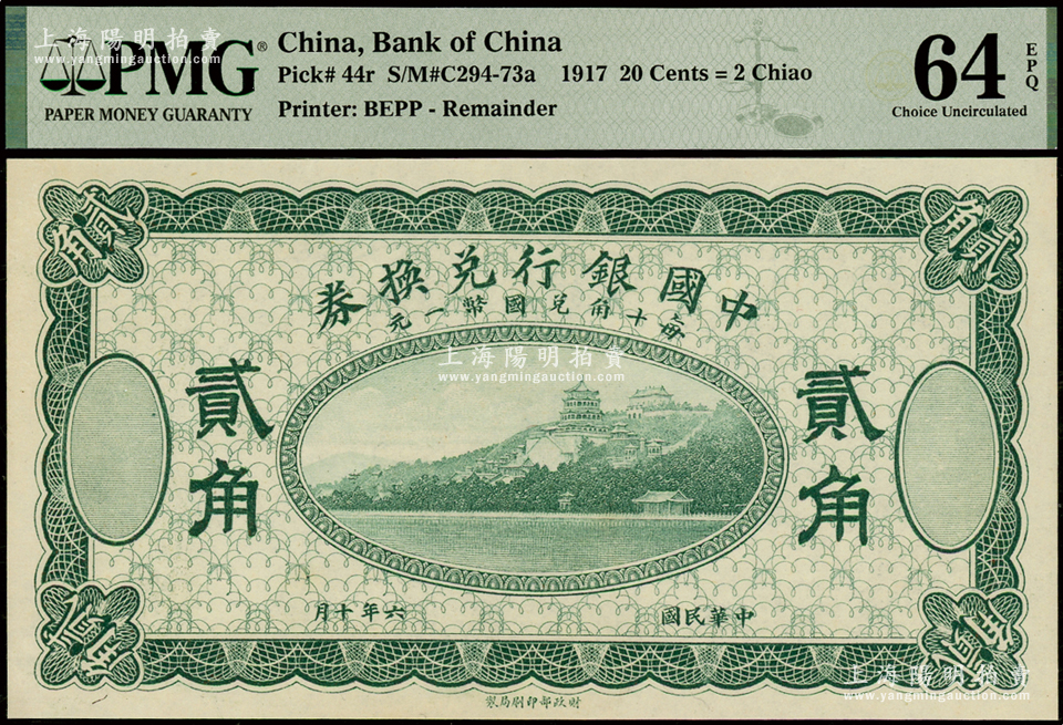 民国六年(1917年)中国银行兑换券贰角,绿色试印票;资深藏家出品,全新