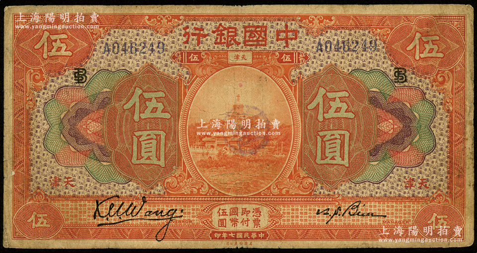 民国七年(1918年)中国银行桔色伍圆,天津地名,王克敏·卞寿孙签名,加印领券“BS”英文组合;资深藏家出品,原票七成新