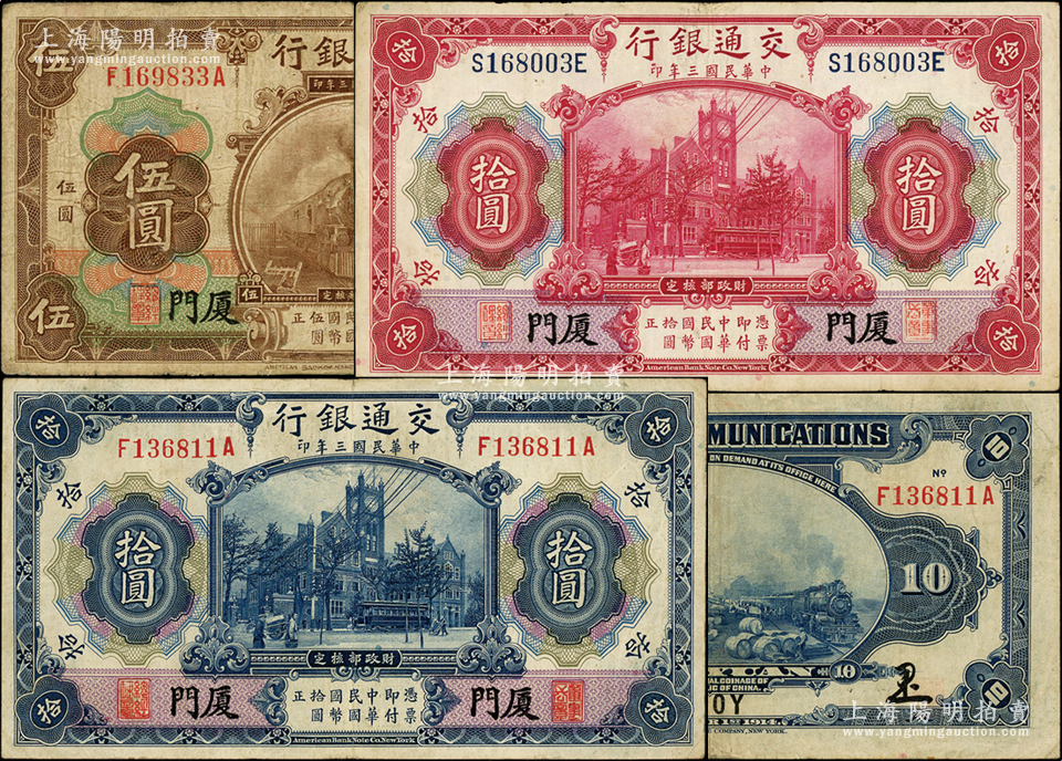 民国三年(1914年)交通银行棕色伍圆、蓝色拾圆、红色拾圆共3枚不同,均为厦门地名;资深藏家出品,七至八成新