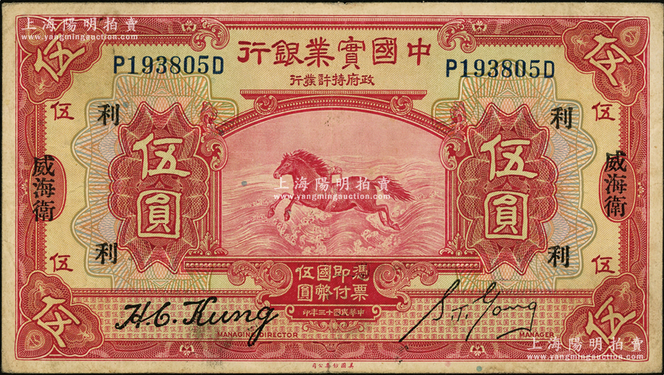 民国十三年(1924年)中国实业银行伍圆,威海卫地名,属第二种签名券,且加领券“利”字;源于前辈名家之遗藏,少见,八成新