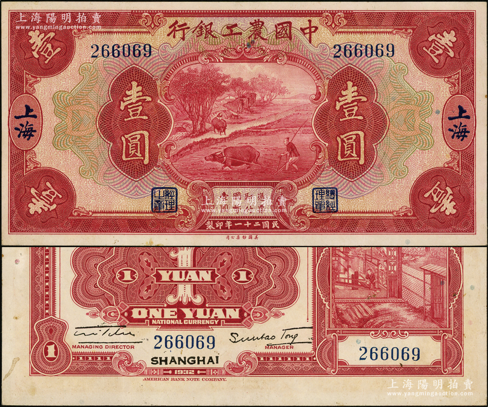 民国二十一年(1932年)中国农工银行美钞版壹圆,上海地名,无字轨;源于前辈名家之遗藏,上佳品相,九成新